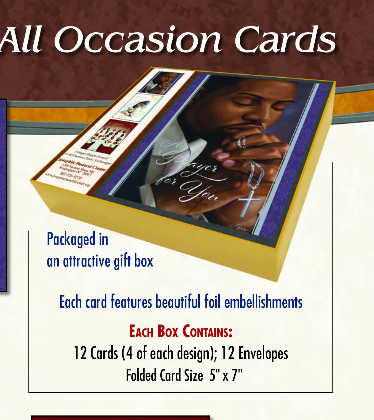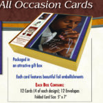 Box of 12 cards-3 unique designs- with beautiful foil embellishments; 12 envelopes included. Packaged in an attractive box and makes a great gift. Cards are 5×7 folded. Box set of 12 is $18.00 plus $8.50 shipping.
