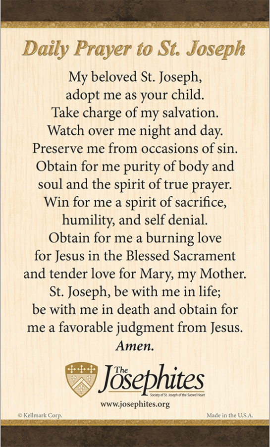Everyone needs a Prayer Card for their wallet, handbag, brief case or even as a bookmark. This conveniently sized, durable prayer card is a regular reminder of our need for salvation and ask St. Joseph to obtain for us a favorable judgement from Jesus.