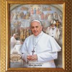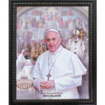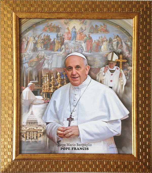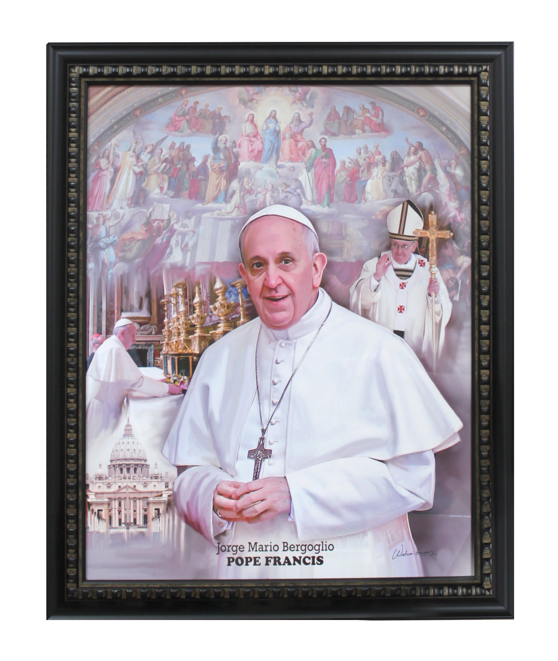 A beautiful print of Pope Francis framed in either black or gold. This print measures 16 in wide by 20 in high.